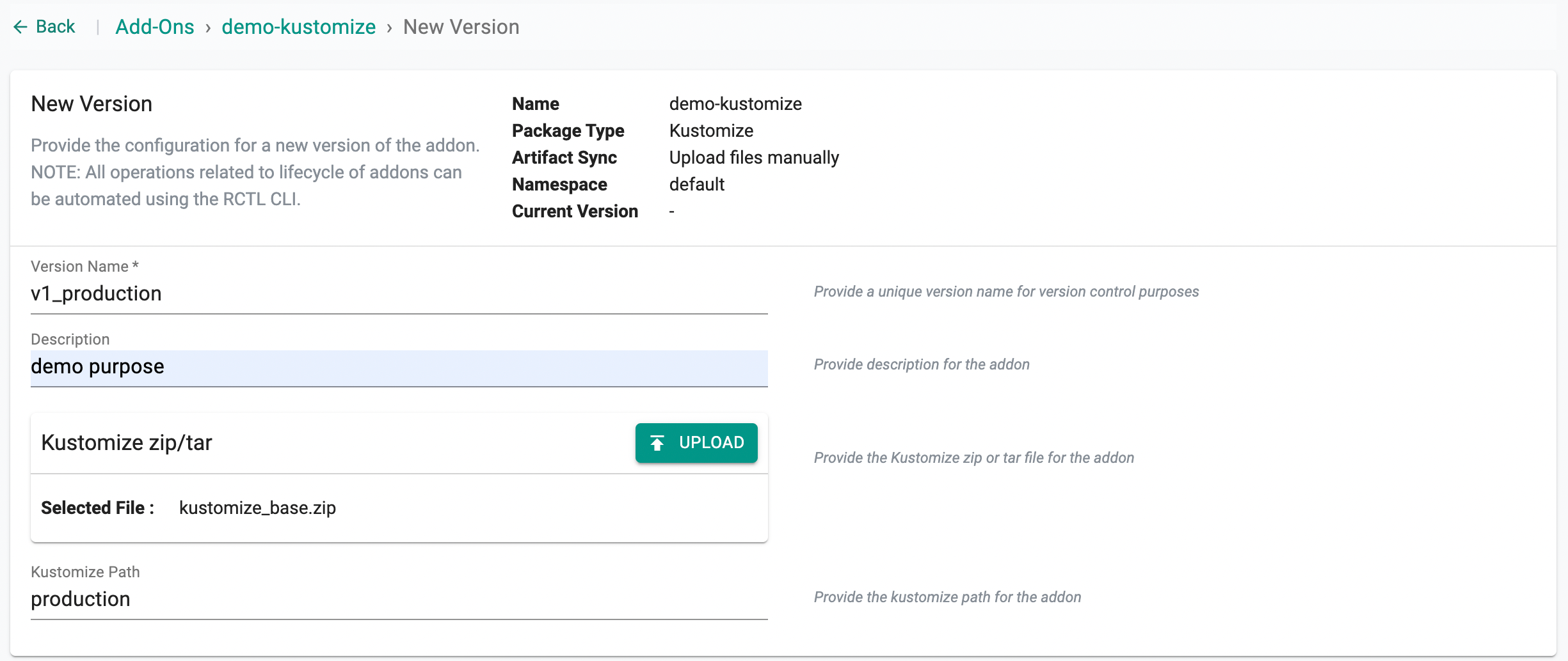 Example 2: In the example below, a new add-on is being created using Kustomize, where the customized manifests are provided as a zipped folder containing the required base and overlay structure.