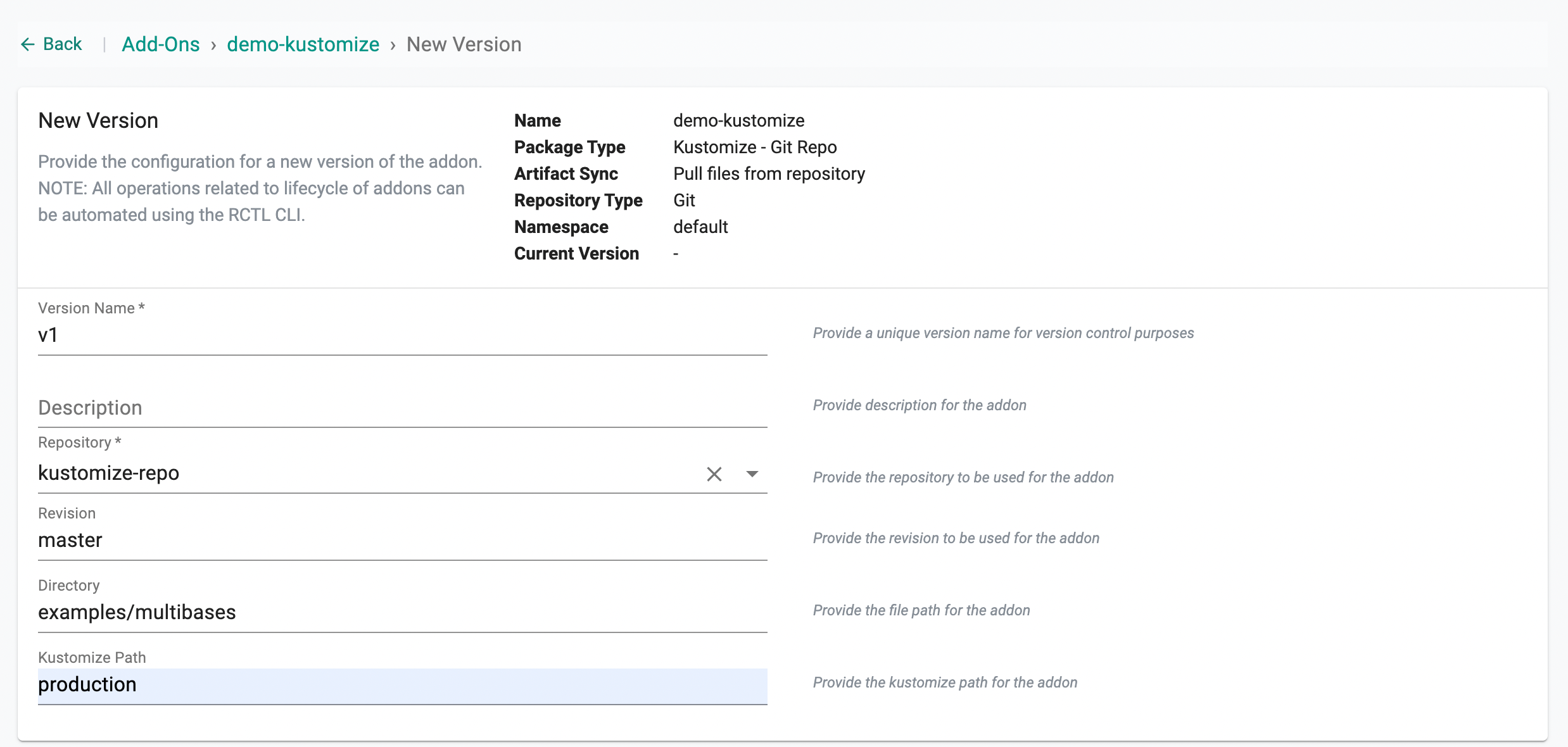 Now that we have created an add-on, you can manage it, including defining values.yaml file by creating a new version.