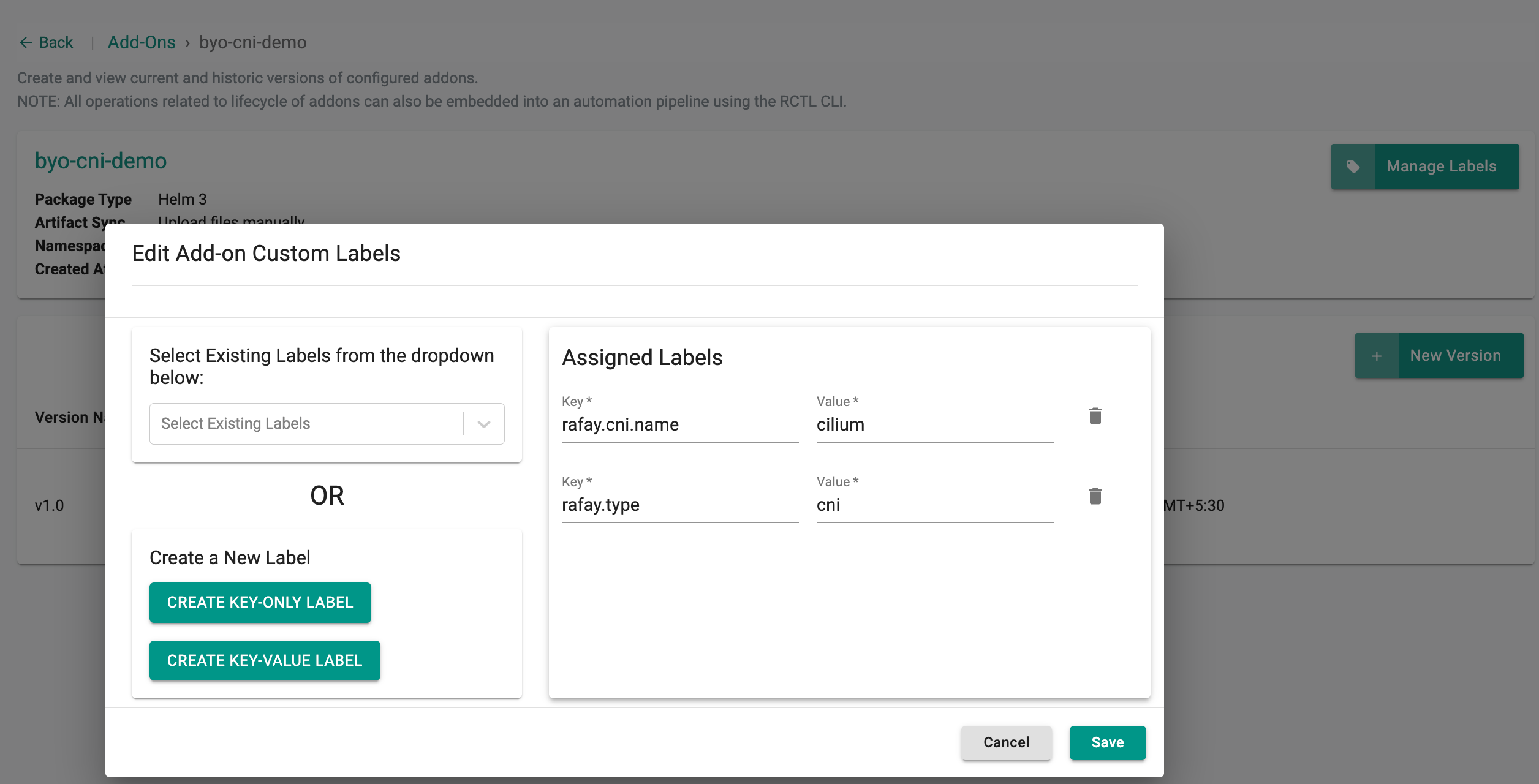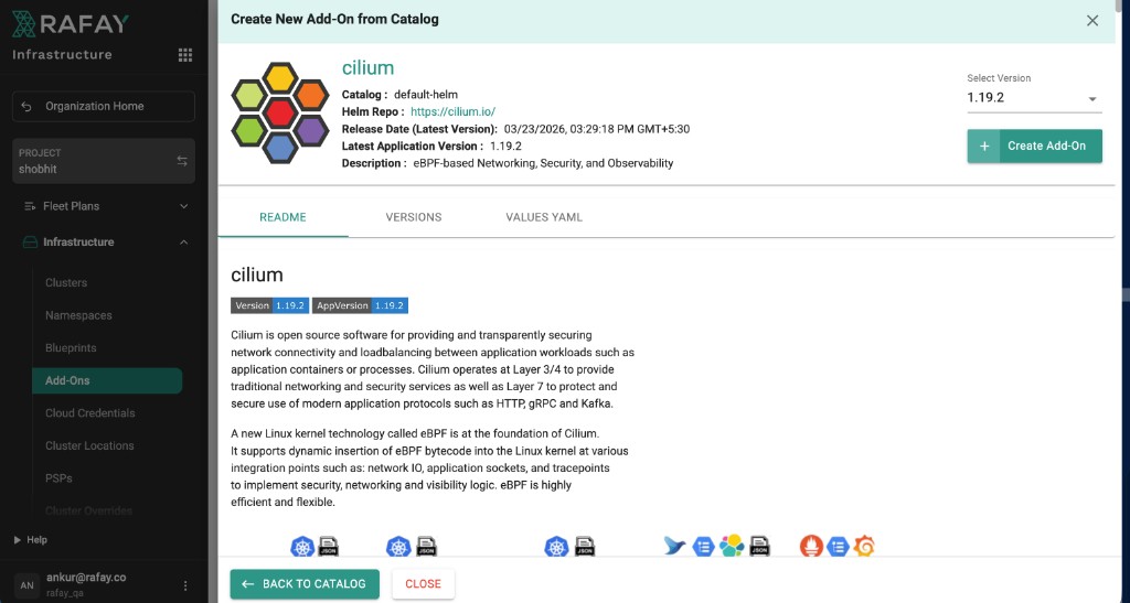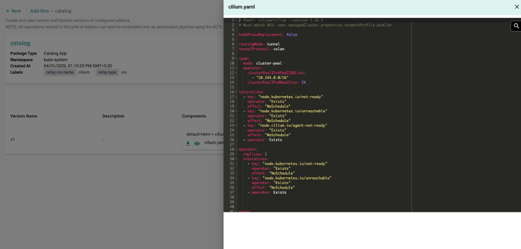 The add-on will be created with the catalog-sourced Helm chart and values. Verify that the mandatory CNI labels (rafay.cni.name: cilium and rafay.type: cni) are present on the add-on.