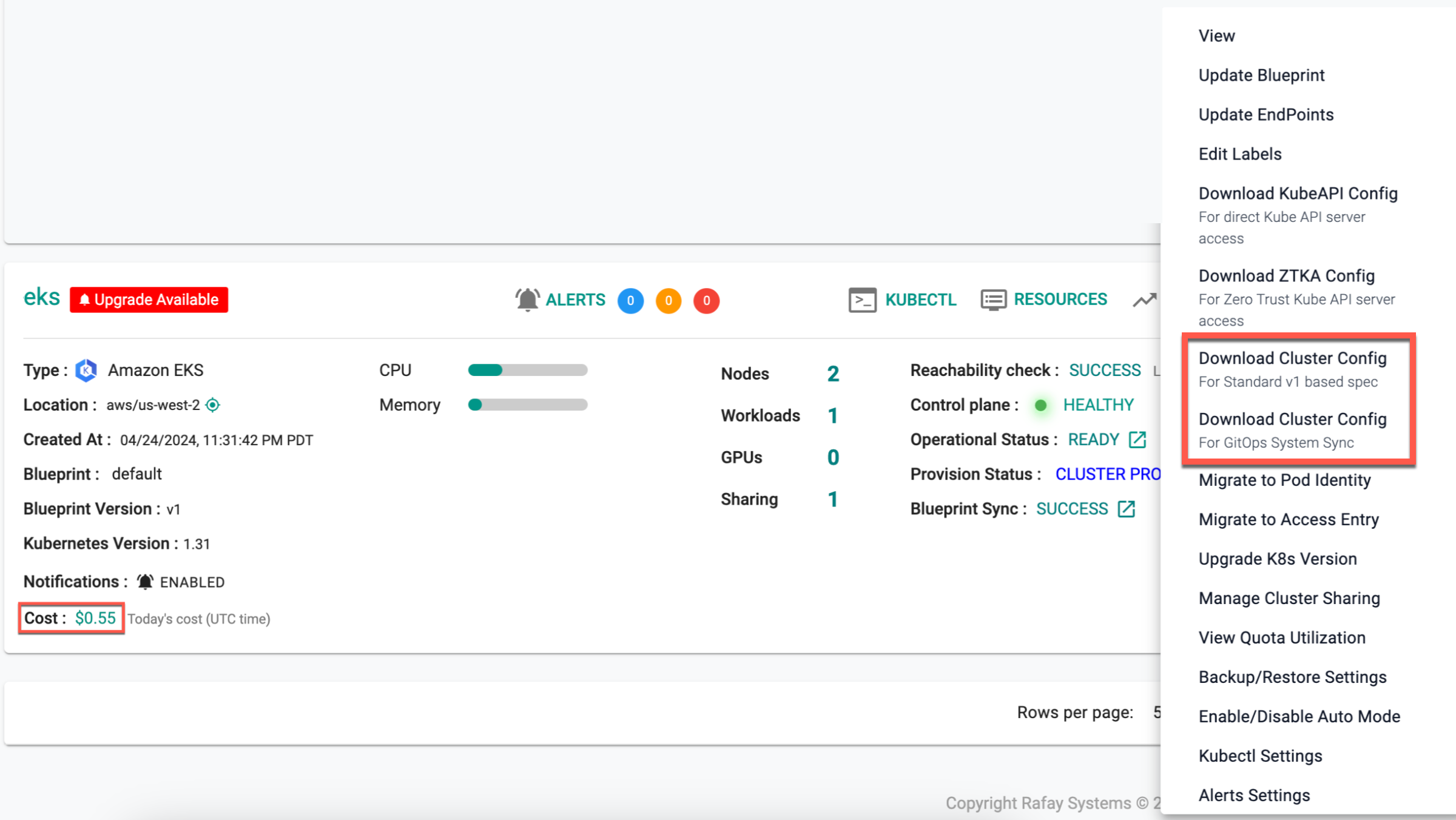 Downloads the cluster configuration in the standard v1 specification format, either from the console, using the RCTL CLI, or programmatically through the REST APIs.