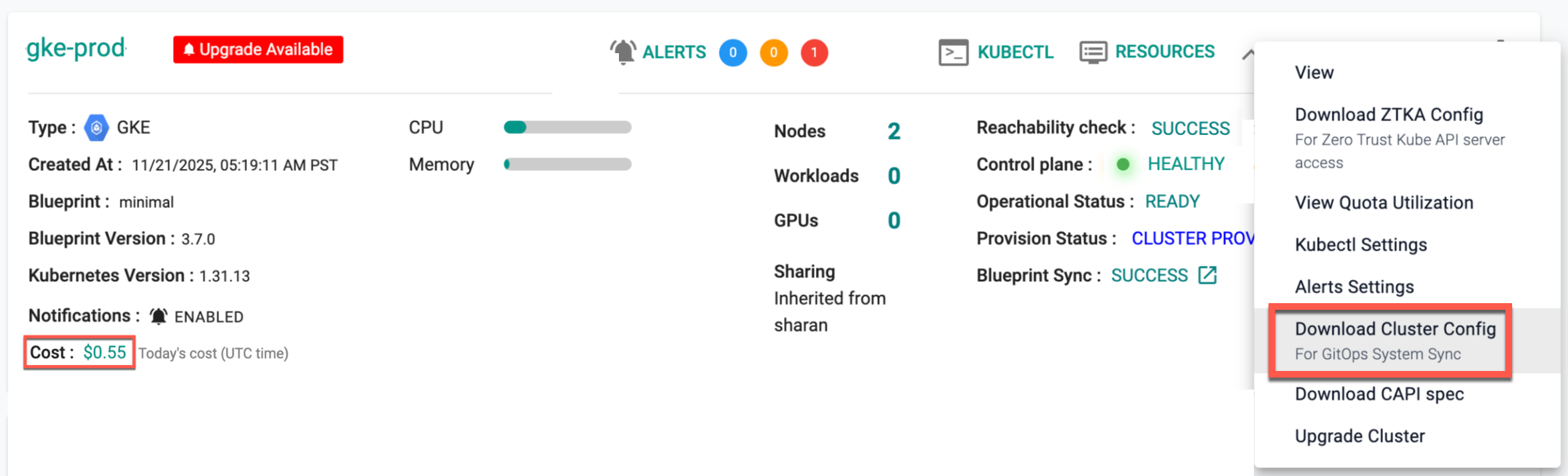 Downloads the cluster configuration formatted for GitOps System Sync, either from the console, or using the RCTL CLI.