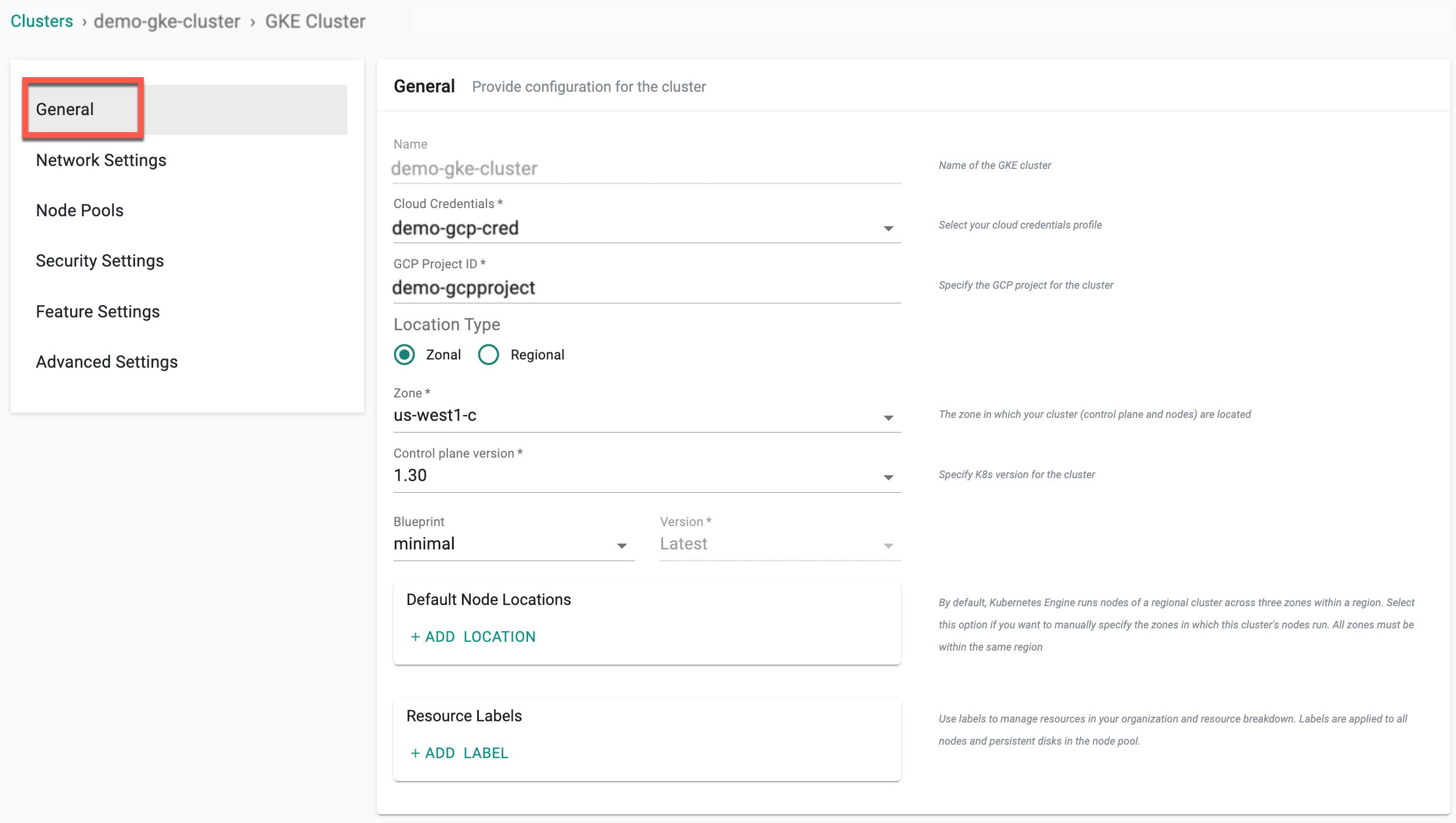 The controller provides users with a "UI Wizard" type experience to configure, provision and manage GKE clusters. The wizard prompts the user to provide critical cluster configuration details organized into logical sections: