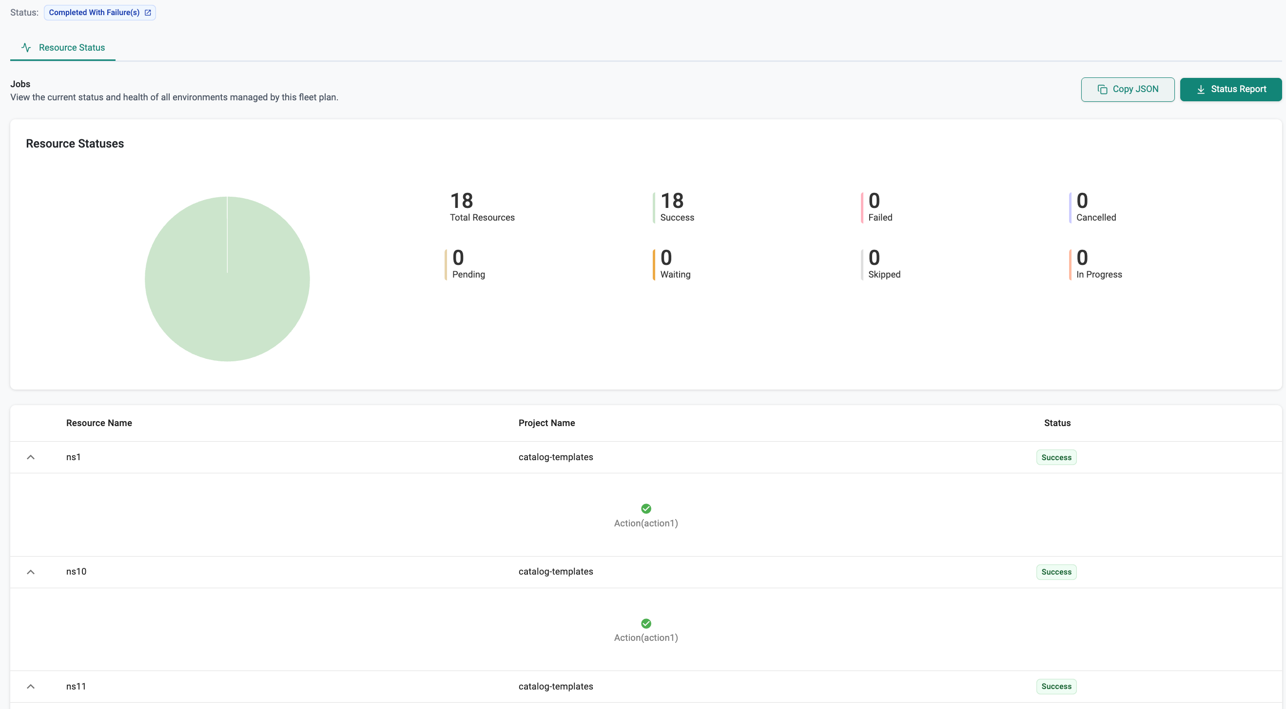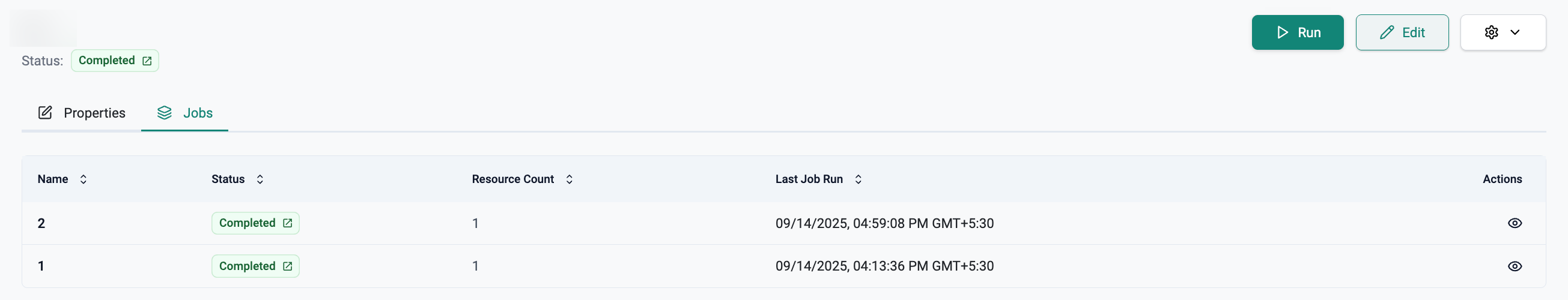 Clicking the eye icon in the Actions column opens the Job Overview page. This view provides detailed insights into the selected job run. The job execution summary provides a snapshot of resource statuses, including the total number of resources and their state. Supported states include: