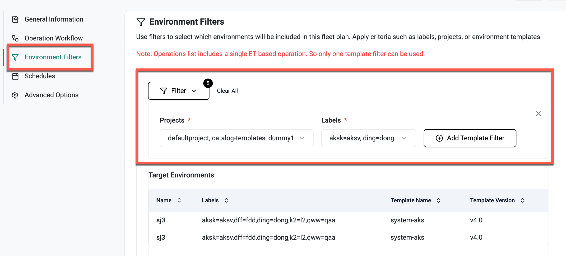 This section allows you to define which environments are included in the fleet plan by applying filters. The filtering works at three levels: