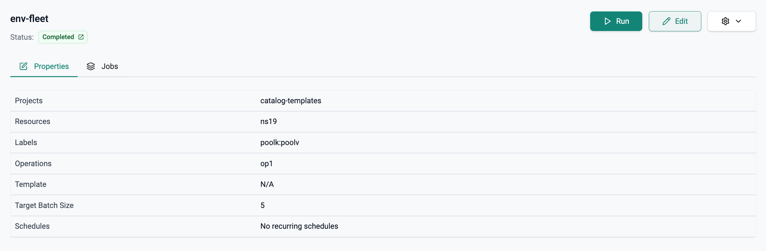 Click the Run button to start a fleet job. The job will then appear in the list with its execution details.