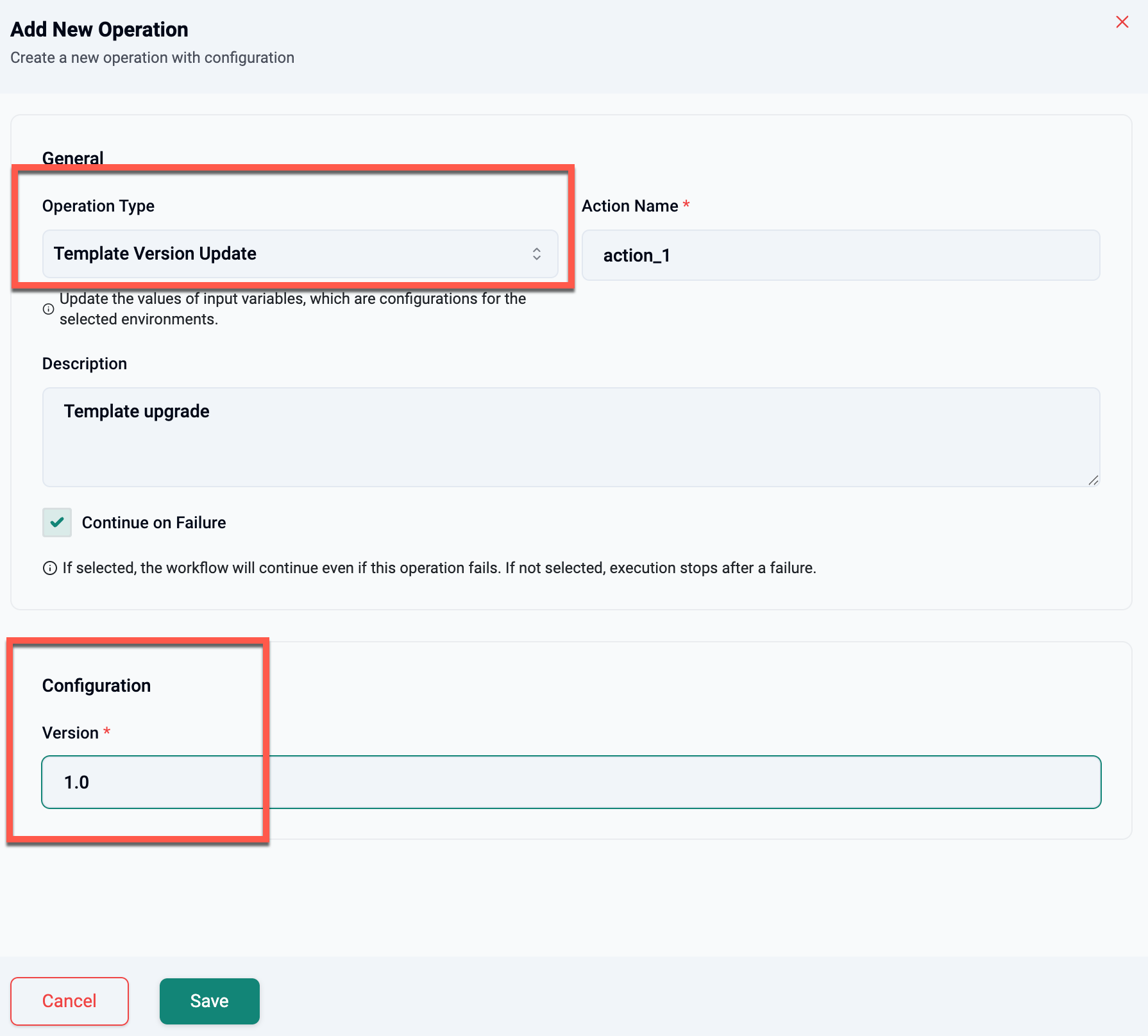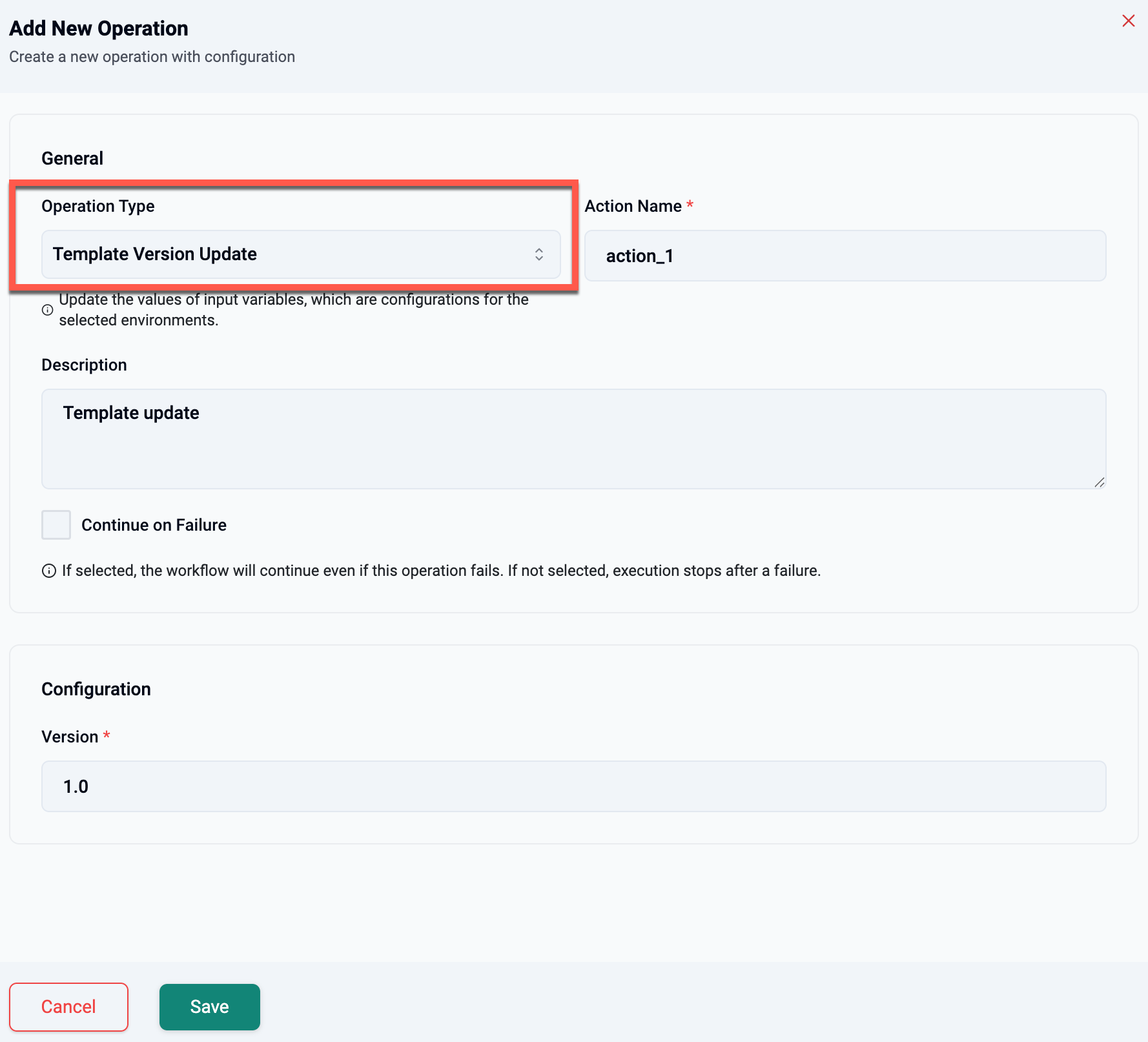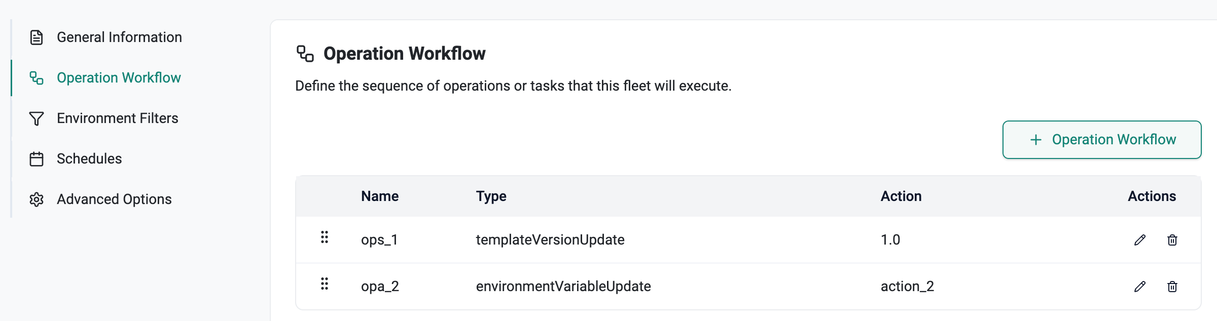 The Operation Workflow defines the sequence of operations or tasks that a fleet plan will execute on the selected environments. Operations can be configured step by step and support different lifecycle actions such as upgrading template versions, updating variables, or managing resources.