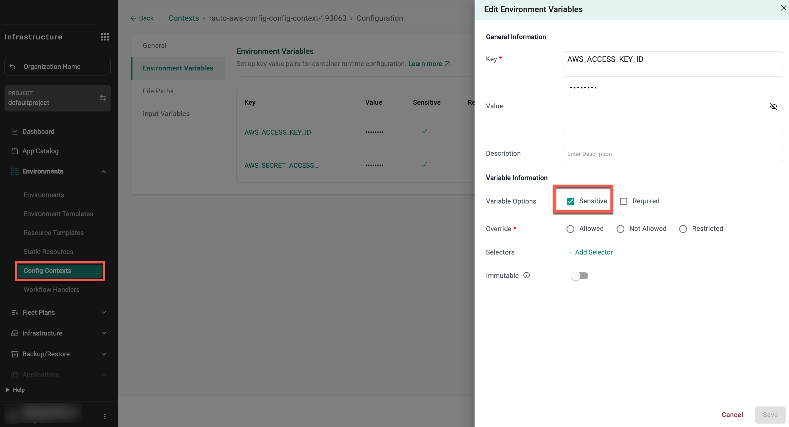 - In Environment Variables or Input Variables, add or edit a variable that contains sensitive data