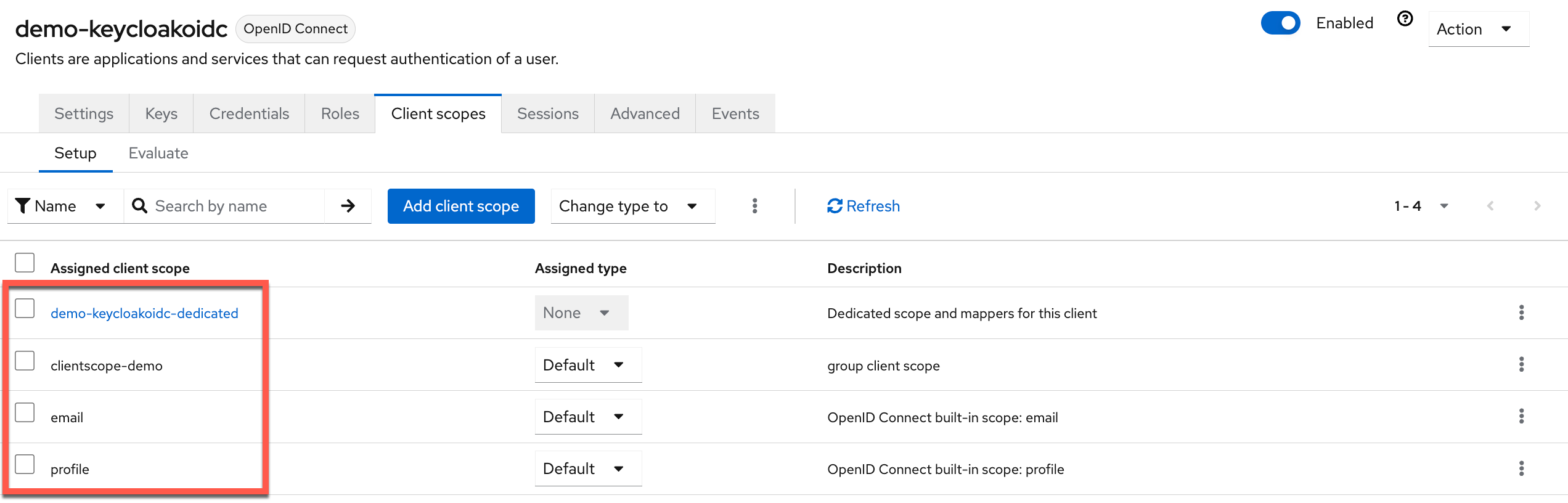 email,profile, and the custom group scope such asgroupdemoclientscope). - Ensure the custom group scope is set to Default. If not set to Default, Keycloak does not return group information, and group reconciliation fails.