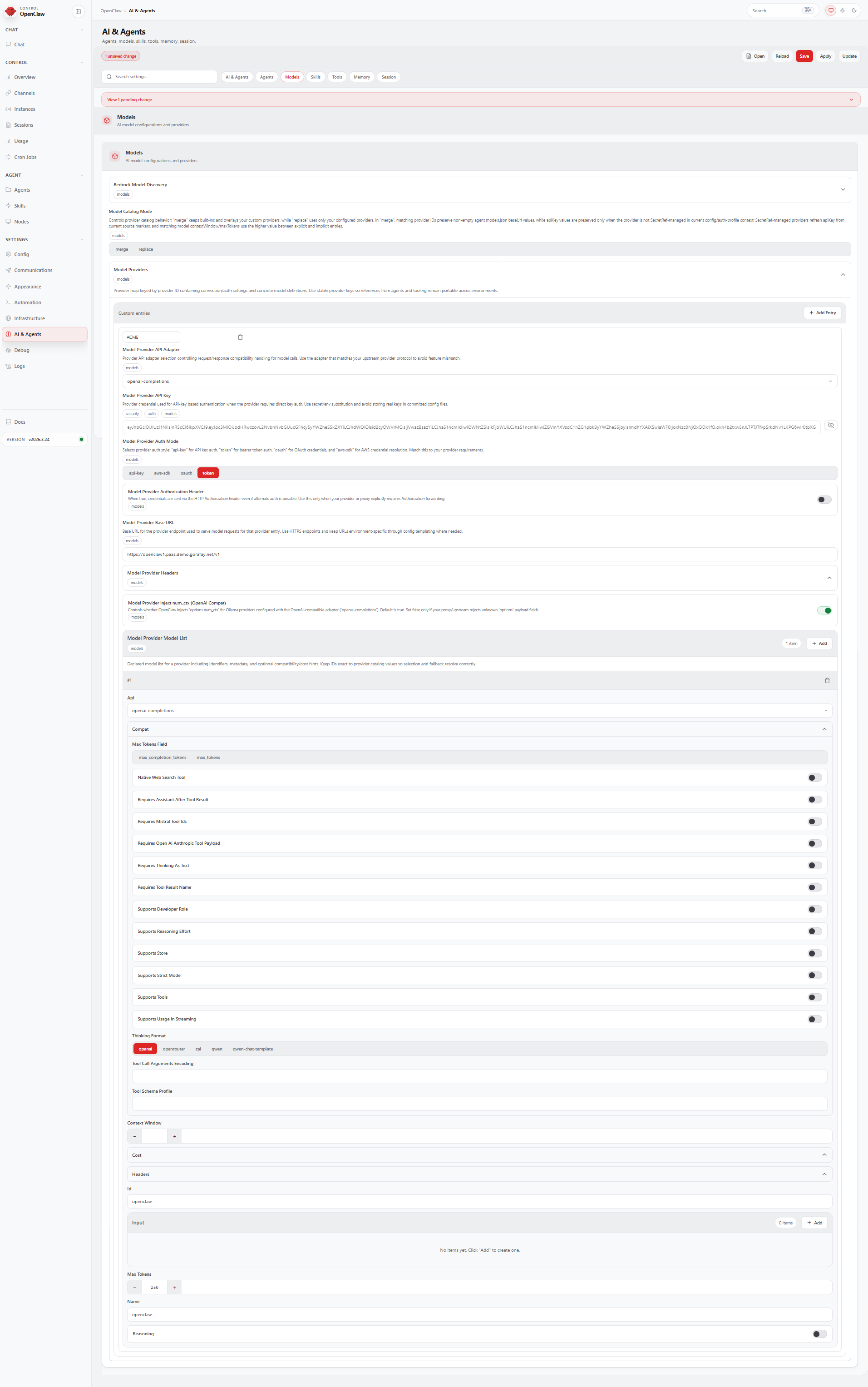 • Select openai-completions for the Model Provider API Adapter