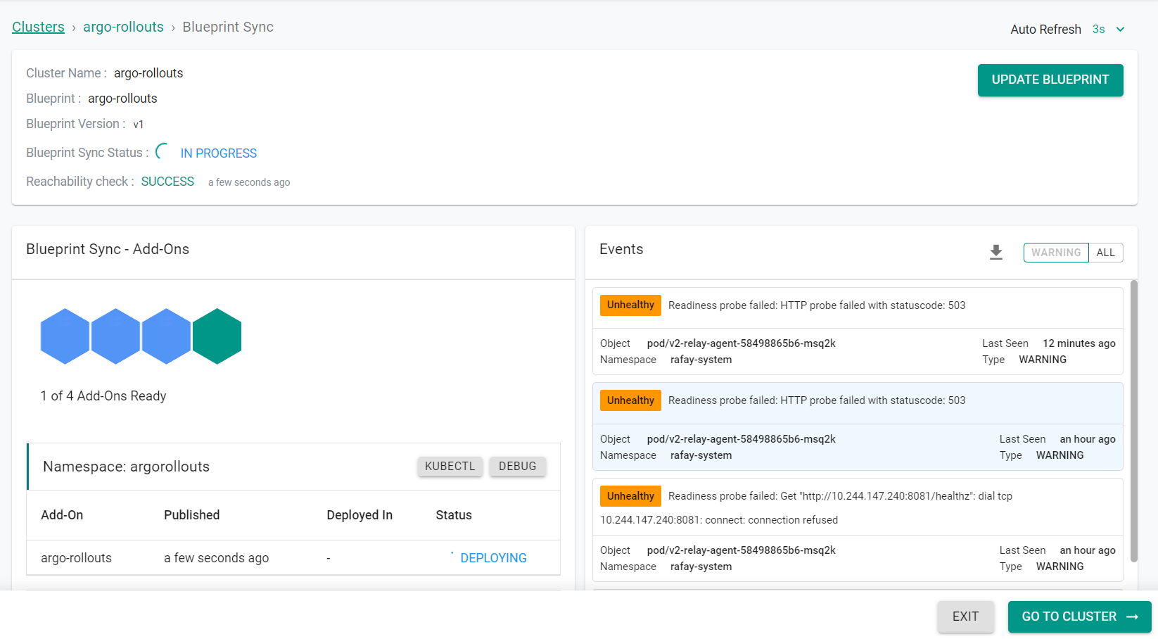 In this step, you will apply the previously created blueprint to the cluster. Applying the blueprint will install Argo Rollouts and the managed system ingress controller.
