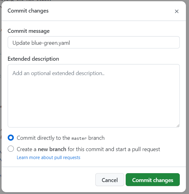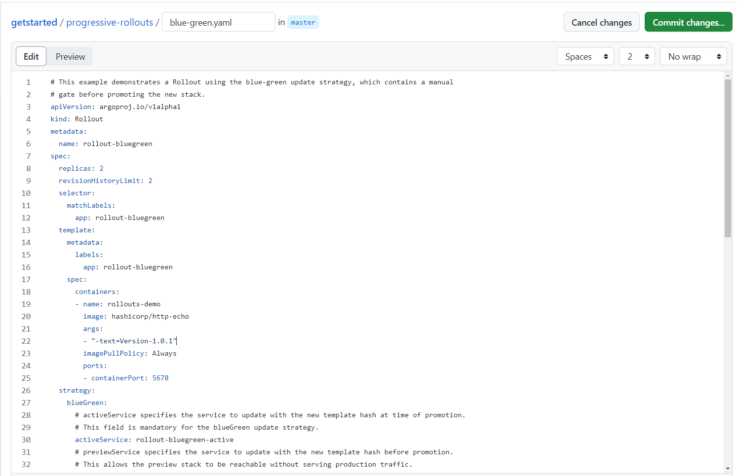 - In your Github repository, navigate to /progressive-rollouts/blue-green.yaml