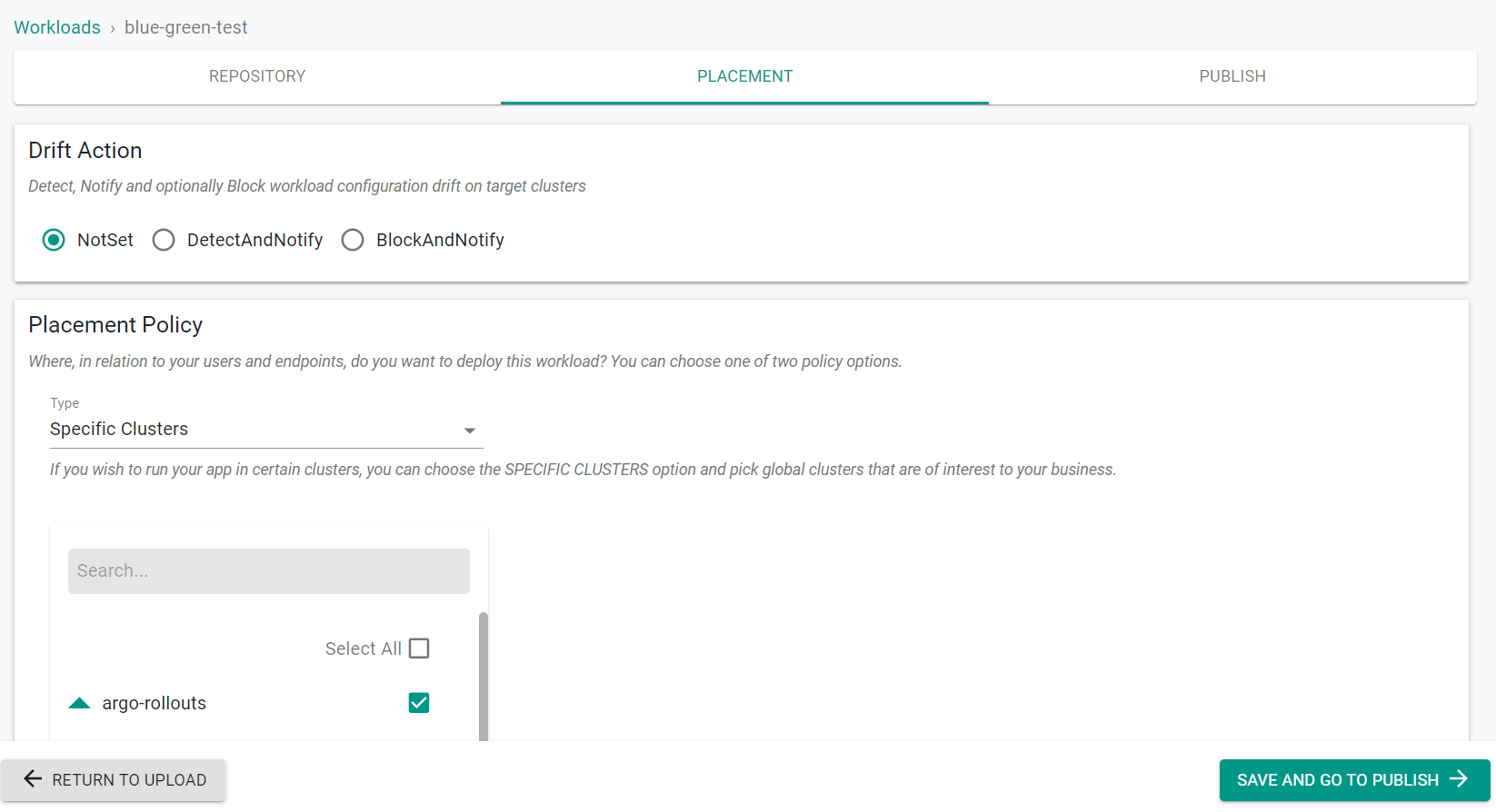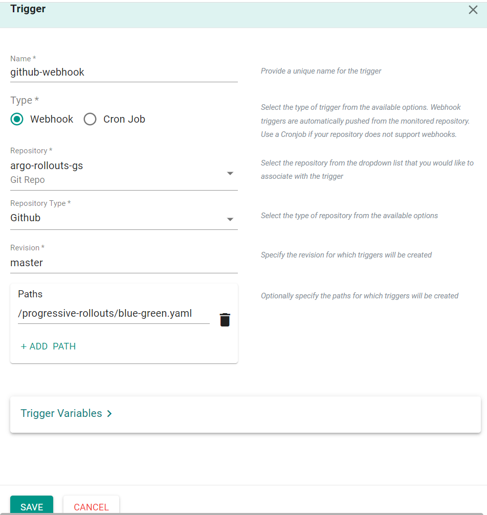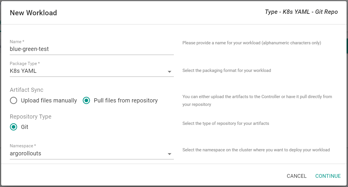 - Enter /progressive-rollouts/blue-green.yaml for the YAML file path