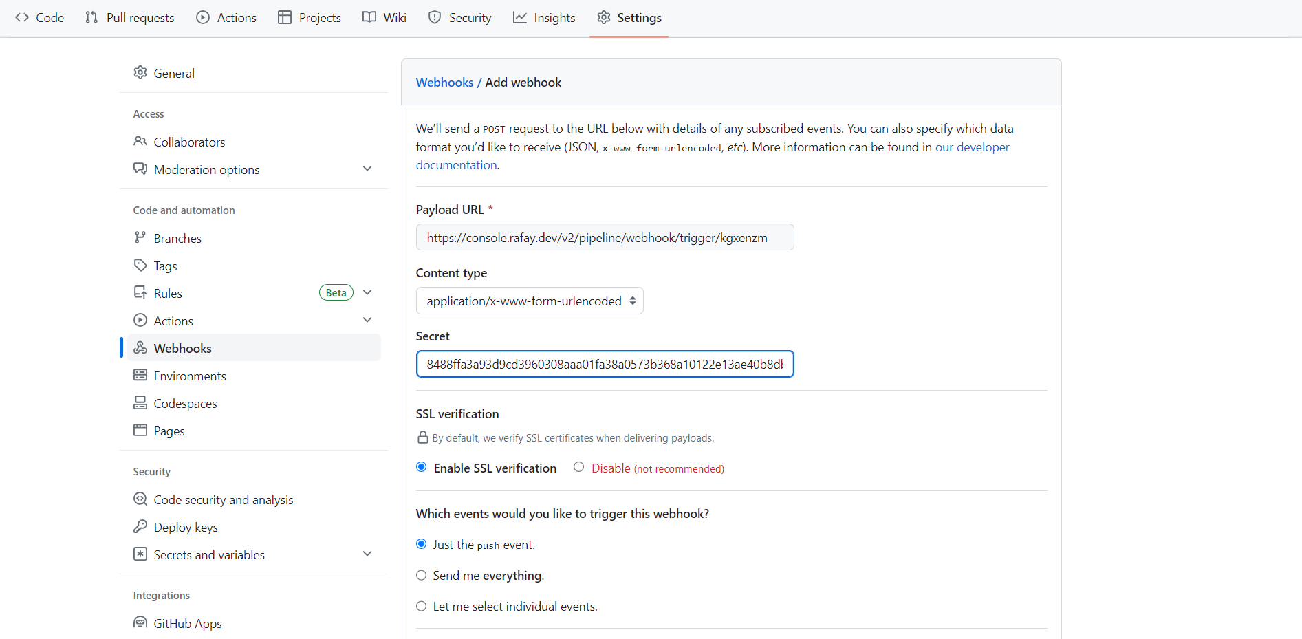 You will now be presented with the webhook configuration details that you need to copy/paste to your GitHub repository. Once you complete this step, the GitOps pipeline will be configured to receive webhook notifications whenever the repository is updated in Git.