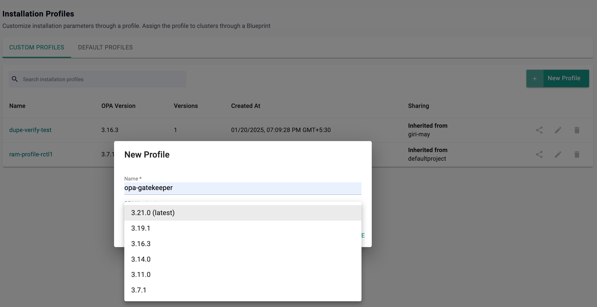 Custom Installation Profiles can be selected as part of enabling OPA Gatekeeper when creating or updating a blueprint.