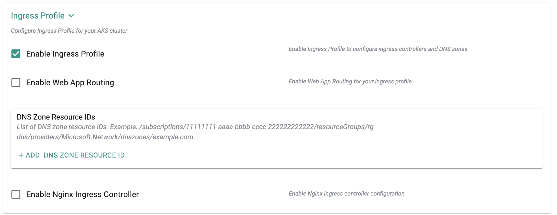 Ingress ProfileKey elements: Enable Ingress Profile, Enable Web App Routing, DNS Zone Resource IDs