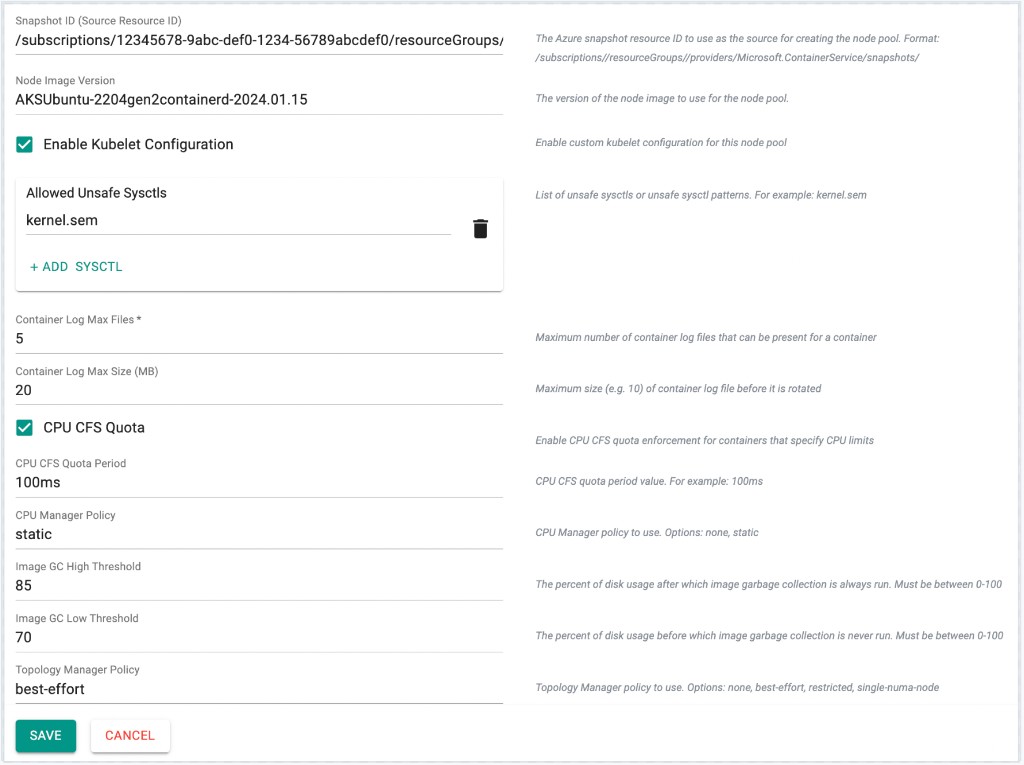 Node Pool ConfigurationKey elements: Snapshot ID, Enable Kubelet Configuration, sysctls, container logging, CPU management, Image GC thresholds