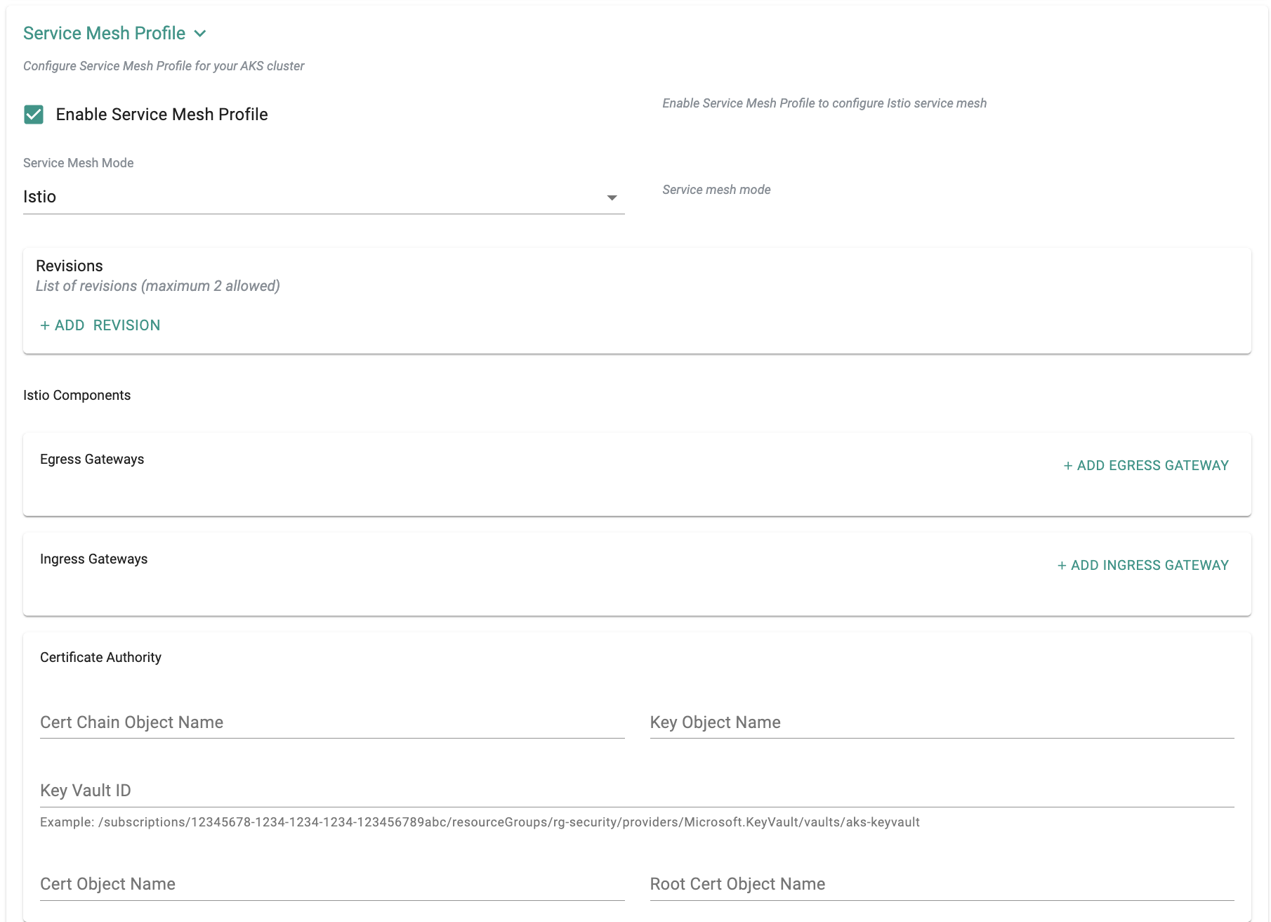 Service Mesh ProfileKey elements: Enable Service Mesh Profile, Istio mode, Egress/Ingress Gateways, Key Vault certificate integration