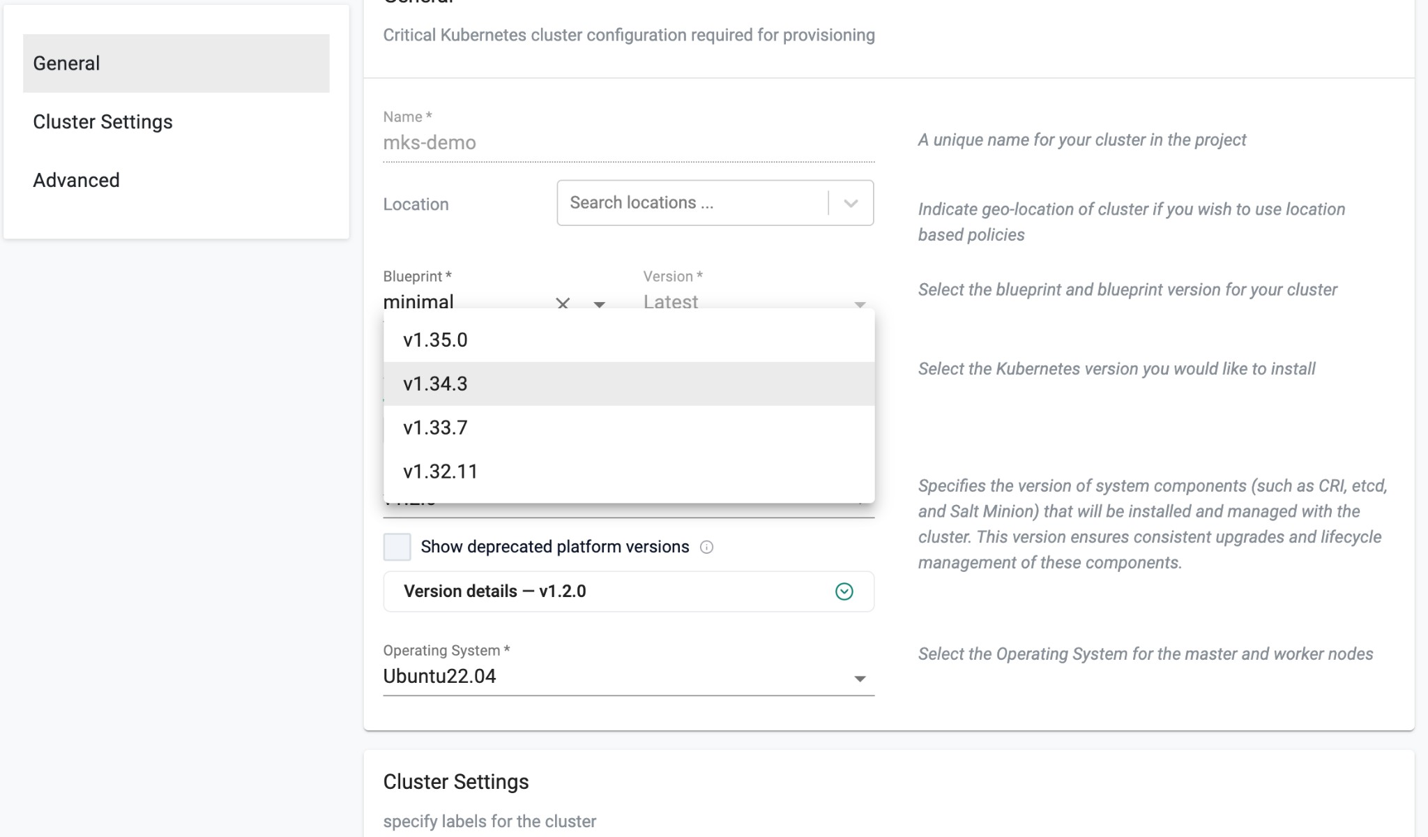 By default, only the latest Kubernetes patch versions (v1.35.0, v1.34.3, v1.33.7, v1.32.11) and platform version v1.2.0 are shown in the cluster provisioning UI.