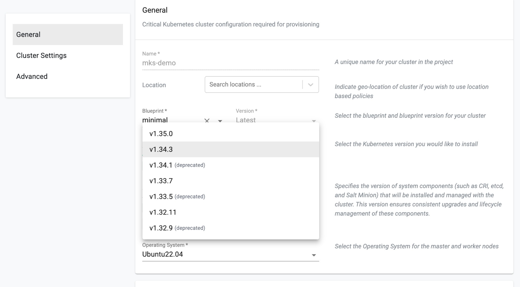 When Show deprecated Kubernetes patch versions or Show deprecated platform versions is enabled, older versions are listed for migration purposes. Using the latest patch versions is recommended.