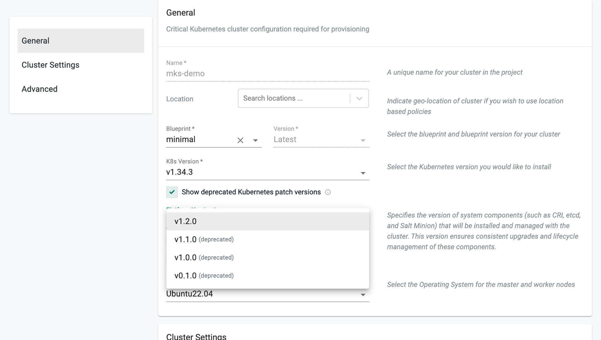 • Platform version 1.2.0 (latest) – Use with these patch versions (includes etcd 3.5.24, required by upstream). Older platform versions (v1.1.0, v1.0.0, v0.1.0) are deprecated but available when Show deprecated platform versions is enabled for migration purposes.
