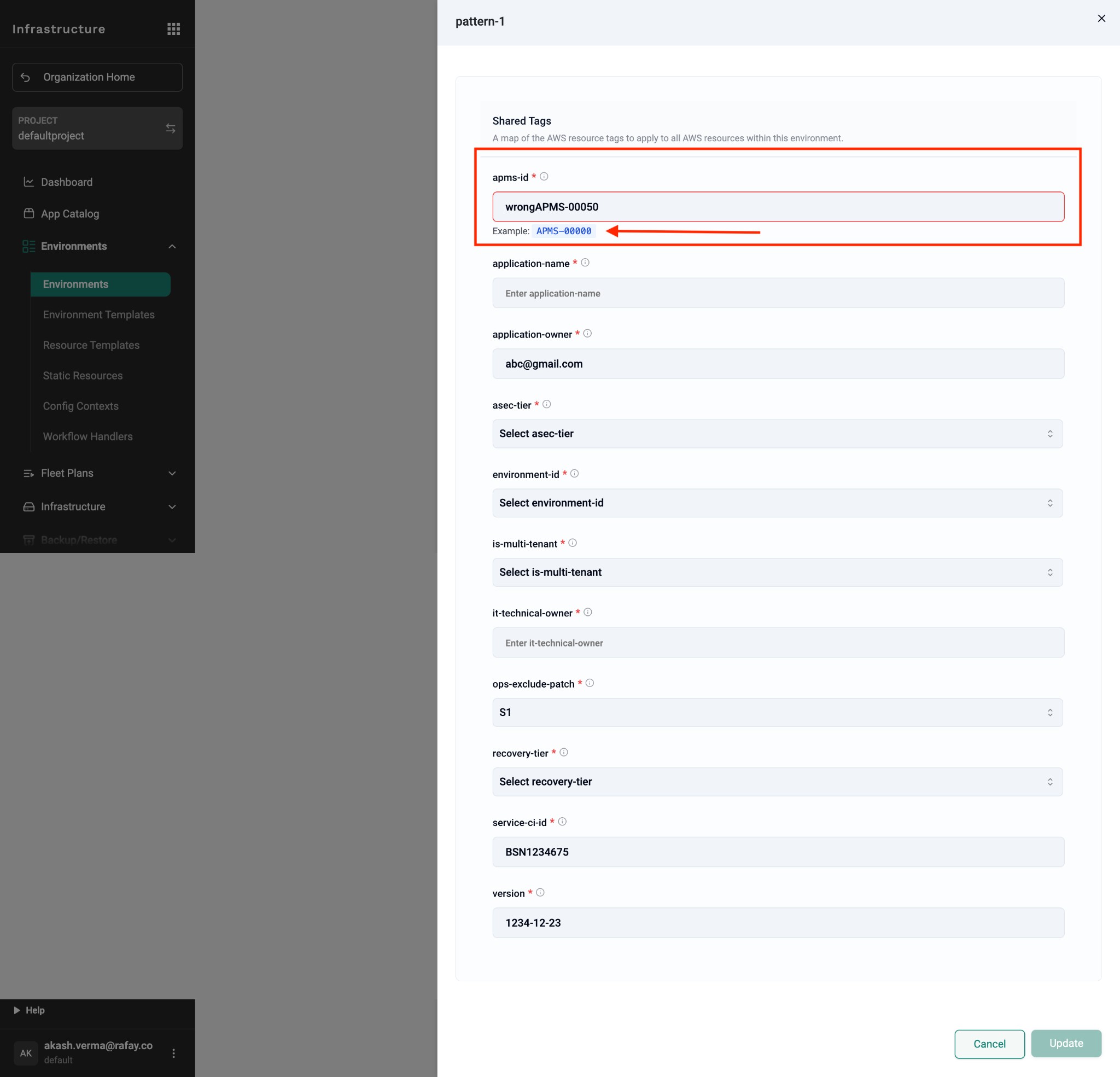 • Environment launch: End users get validation and example help text when providing input values. If a value doesn't match the regex pattern, the UI shows the expected format (e.g., "Example: APMS-00000") to reduce errors and enable a self-sufficient workflow.