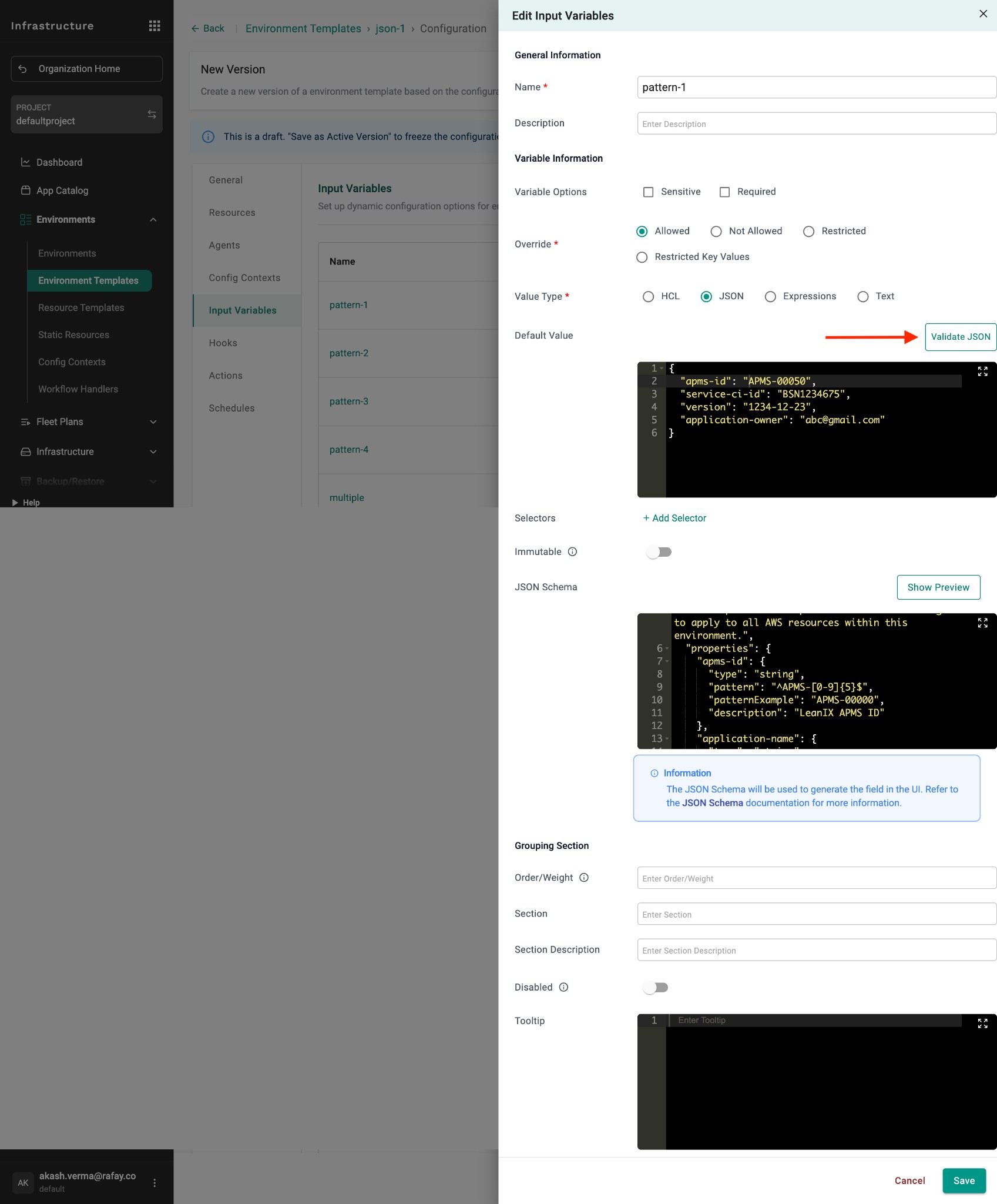 • Template creation: Platform engineers get JSON and regex pattern validation when creating templates. Use the Validate JSON button and define patterns with patternExample in the JSON Schema.