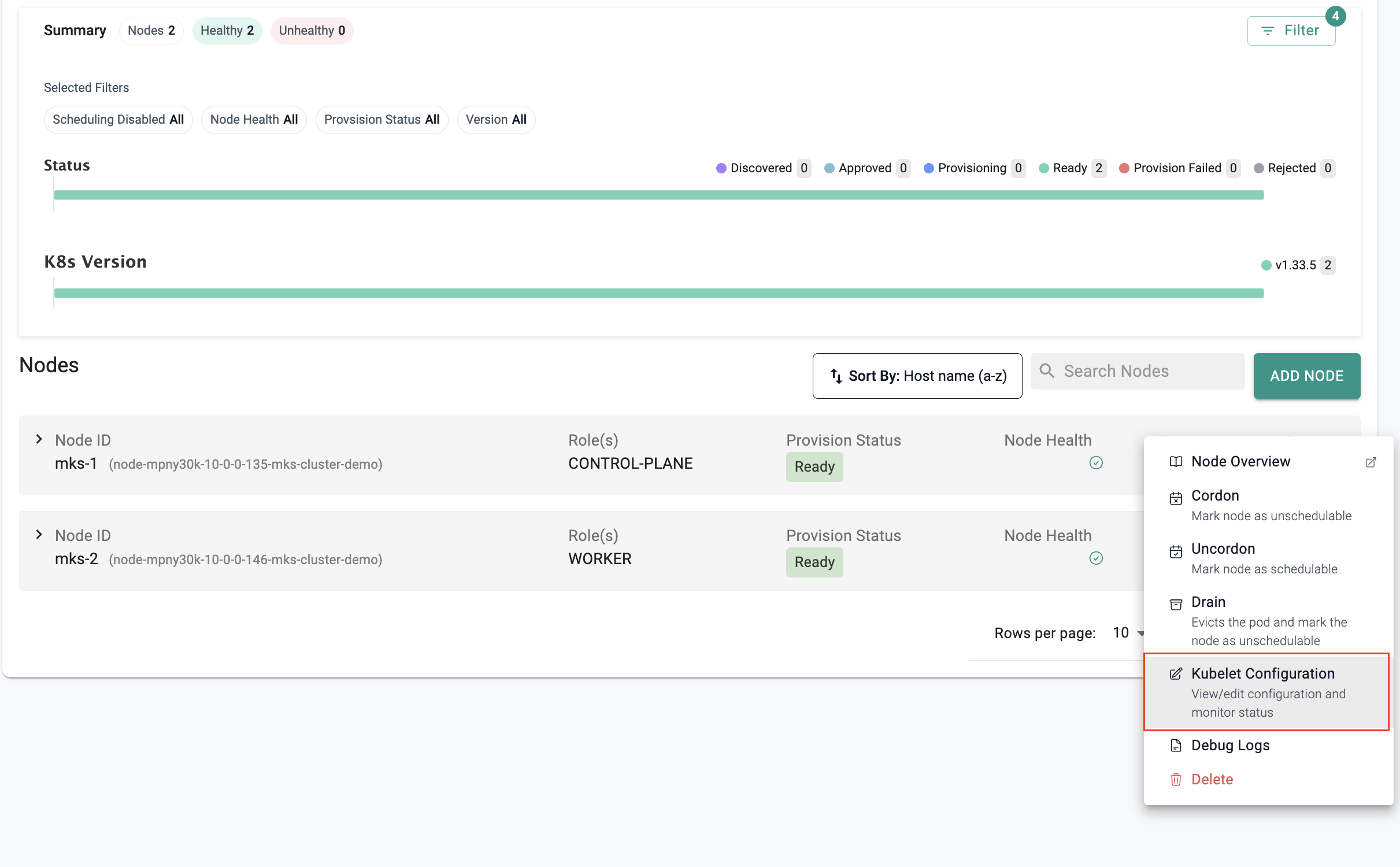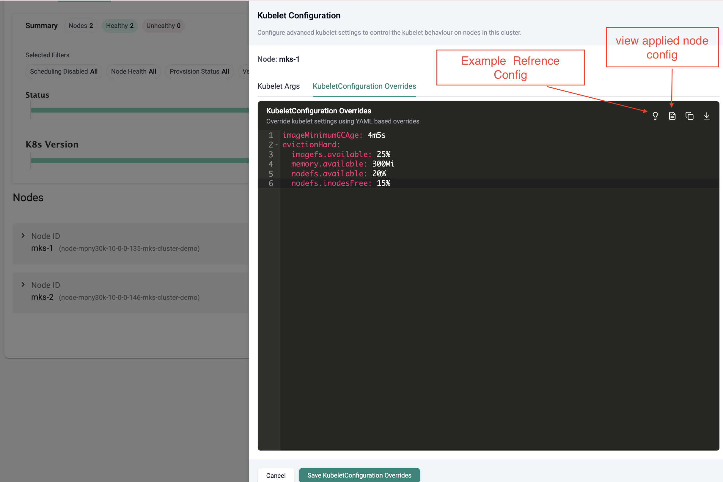 To configure kubelet settings at the node level, navigate to the nodes section configuration and select the Kubelet Config option.