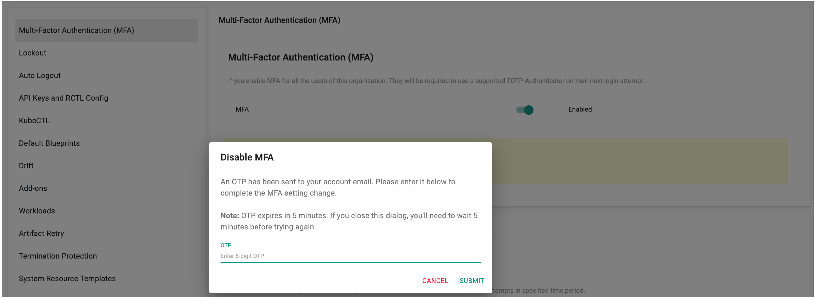 Note: The OTP is valid for 5 minutes. If the dialog is closed or the OTP expires, a new attempt is required to disable MFA.