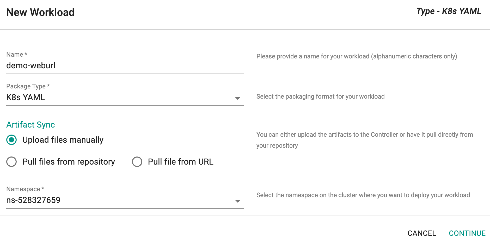 - Pull file from URL: Provide a direct URL from which the controller can automatically fetch the YAML artifact.