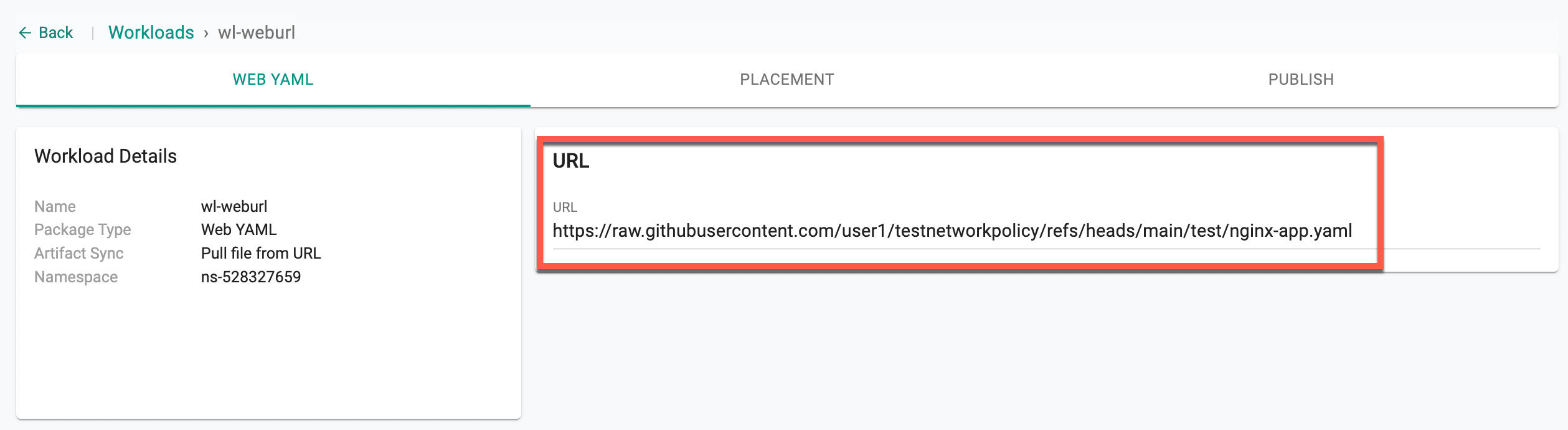 In the example below, the workload named wl-weburl uses the K8s YAML package type and Pull file from URL artifact sync option. The YAML file is fetched directly from the specified GitHub raw content URL, and the workload will be deployed in the namespace ns-528327659.