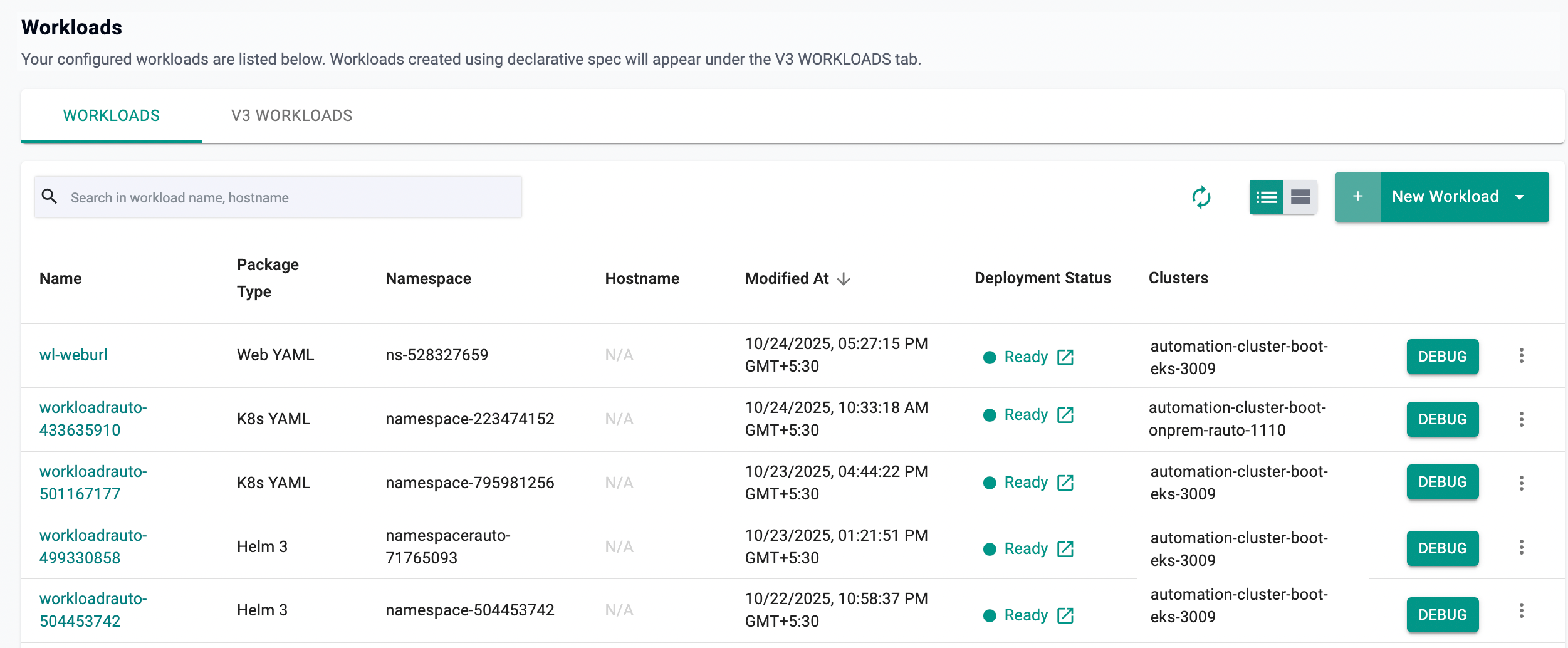 Once the workloads are published, the list of workloads can be viewed as shown below.