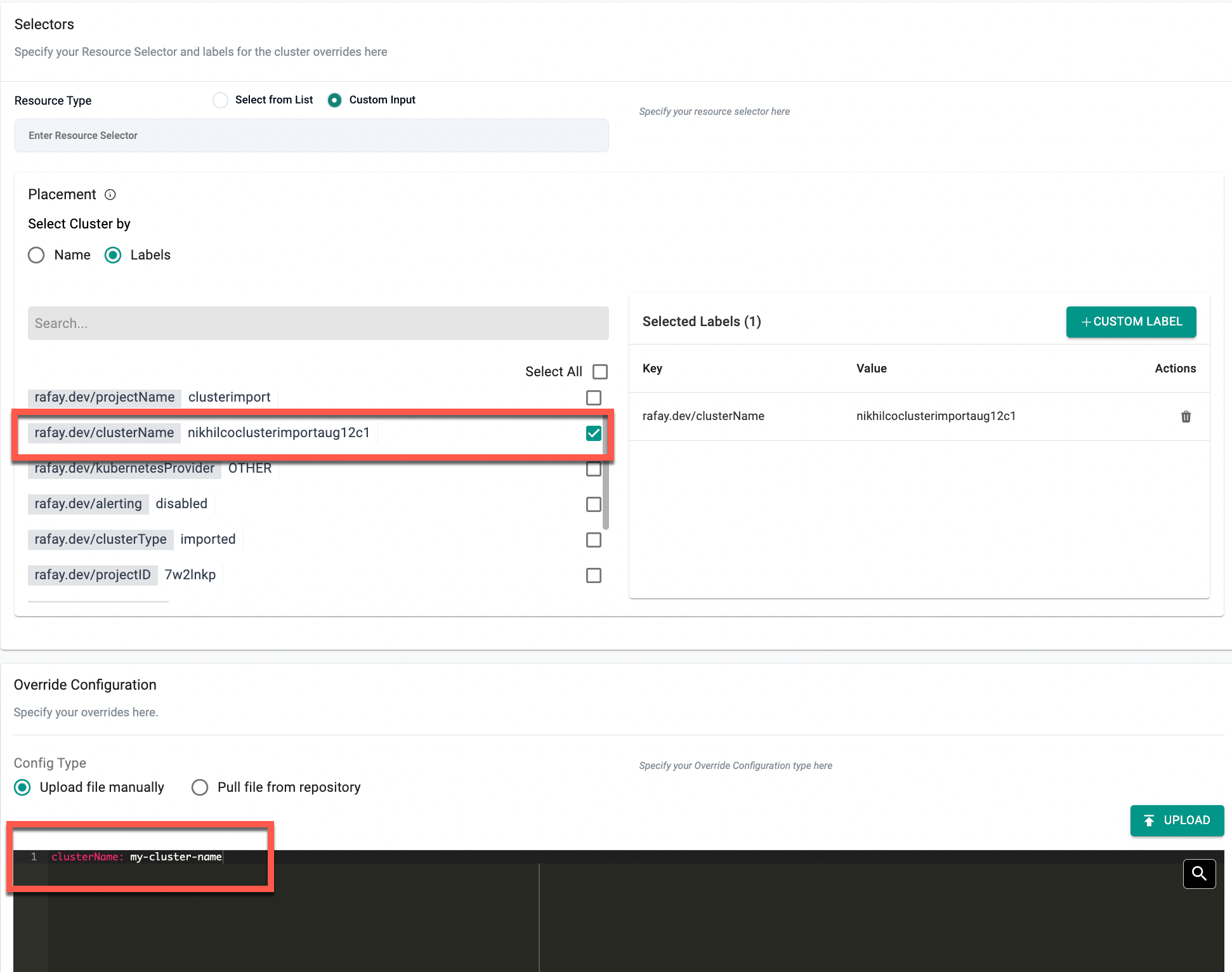 Platform resources such as addons and workloads utilize labels which are added by the platform or by the end user. These labels are used as selectors for both the resource they will be applied as well as the clusters where the cluster override will be applied.