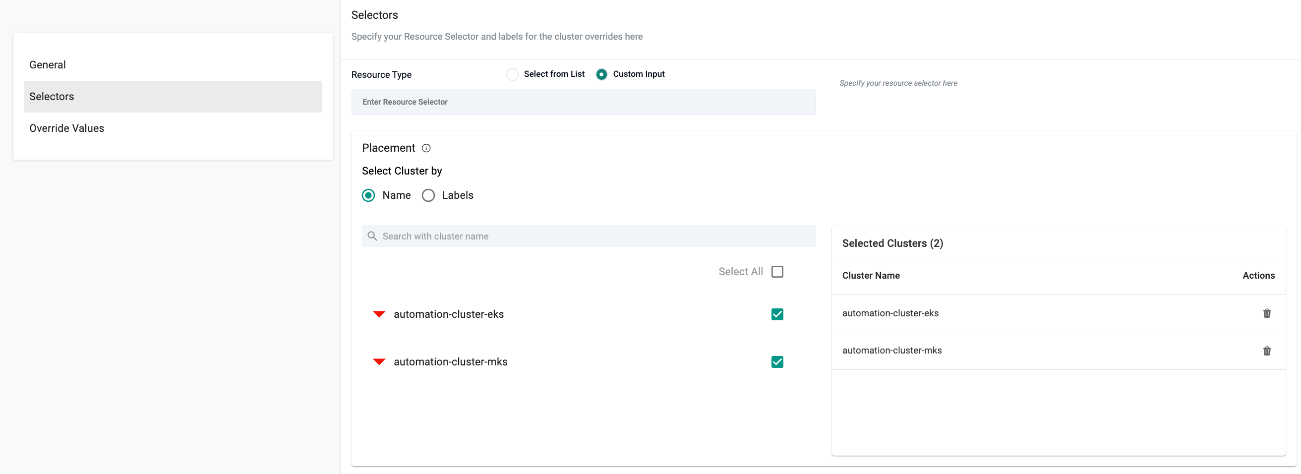 - Select the required Resource Selector and Placement type. The example below shows the Specific Cluster type