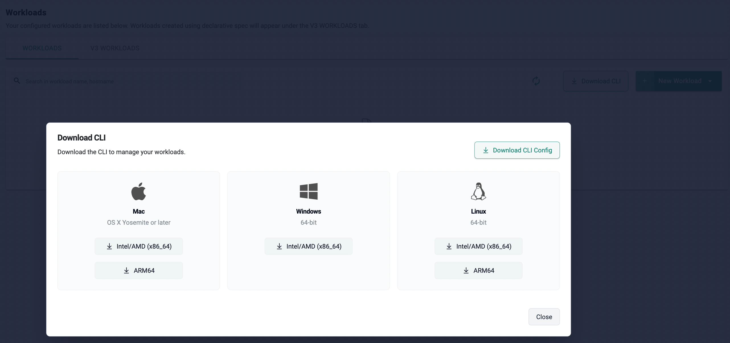 The Download CLI option is available in the Workloads page. This provides a convenient shortcut for users who need the CLI while working with workloads.